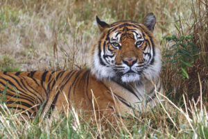 - 03 Magestic Observer Shooting from a low angle makes this image pop, as the hazel-eyed tiger glares directly into the viewer’s eyes. Almost an inquisitive stare, are we next for lunch? It’s pin-sharp, with colours vibrant and true to life. The exposure is balanced, bringing out the details in both highlights and shadows. A lovely portrait of a Bengal Tiger. M