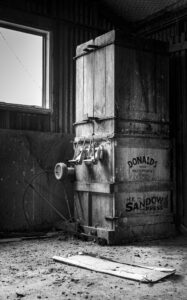 - 04 Wool Press Arapohue m The window in this image dominates the scene; perhaps the photographer could have changed the angle or adjusted it in post-processing. The subject appears old and gritty, giving the scene a rustic grunge aesthetic. M
