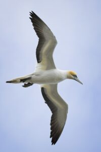 - 02c-Flight Of A Gannet – What a wonderful photograph of a gannet. Full wingspan. Great detail in her feathers. Well exposed. Just enough space to fly into, though you could possibly have had a little more. Highly commended As a set, you have silvery tones in all three photographs. Perhaps swap the first and third ones, and then the gannet flies towards the coastal scene, and the monkey looks back towards the other photographs.