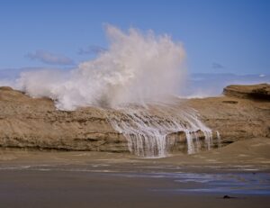 - 03b_Danger Zone – The wave has been so well captured, and the spray detail is sharp. This is a well-balanced photograph. Spray, the sweep of the rocks with dribbling water, then sand with some unperturbed birds. The blue in the sky is also reflected in the sand. Honours