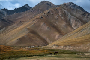 - 08b_Yurt Village – What a barren landscape! Though with lovely soft colours. The small scale of the horses leading you to the tiny Yurt village makes the mountain landscape look huge and gives a feeling of the remoteness to the photograph. There are some lovely angles and triangles in the lower landscape and mountains. Highly commended